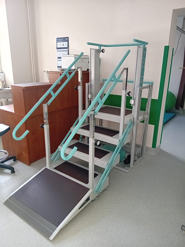 Kolejnym elementem nowego wyposażenia są regulowane elektrycznie schody rehabilitacyjne Gostep z możliwością przekształcenia w tor przeszkód. Urządzenie to będzie wykorzystywane przede wszystkim w terapii pacjentów neurologicznych – m.in. po udarach czy urazach – u których konieczna jest odbudowa utraconej funkcji chodu.